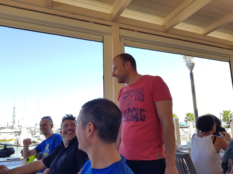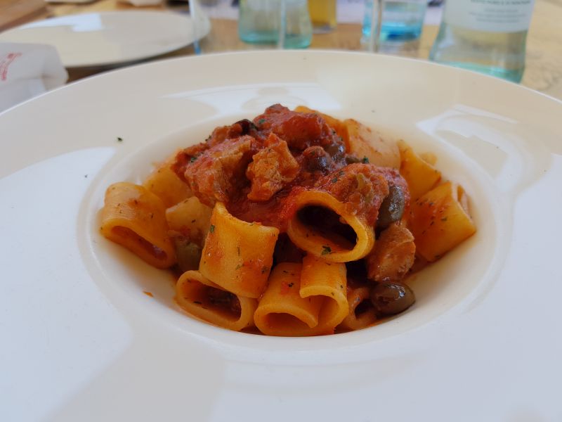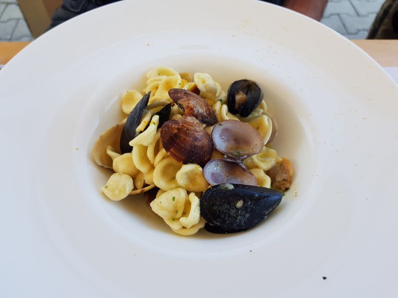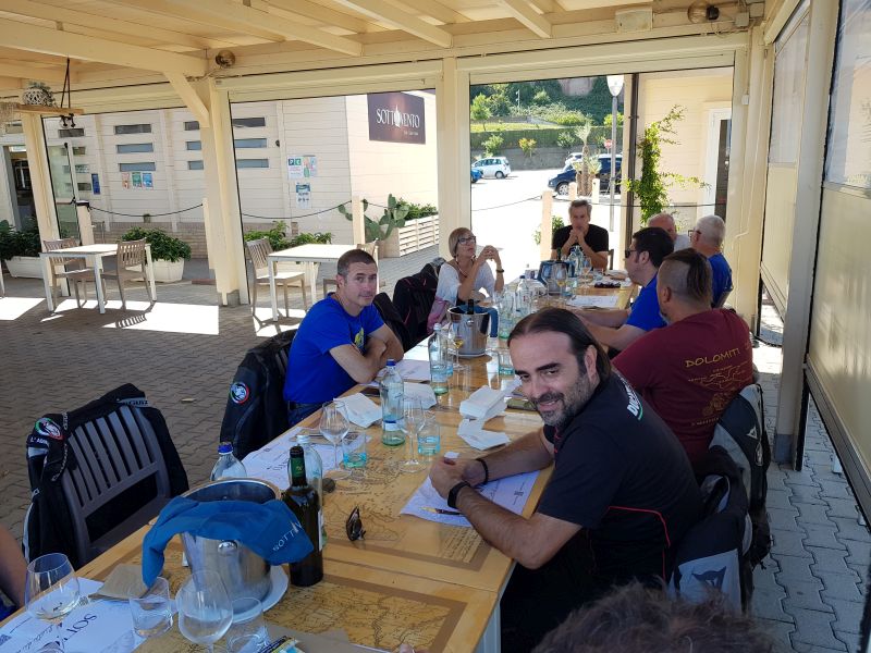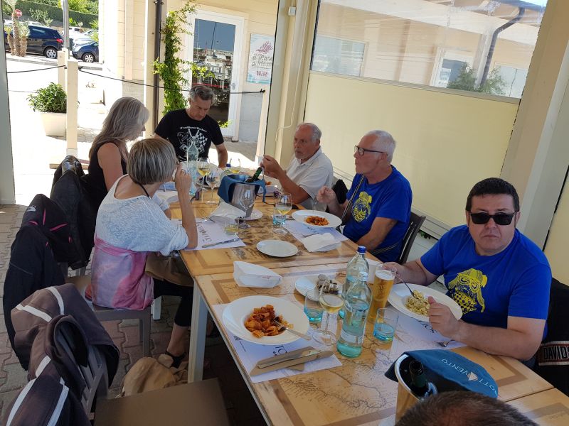 Alcuni di noi prendono le orecchiette allo scogli, altri la calamarata con il tonno fresco, capperi e pomodoro. Poi arrivano le fritture per tutti. Il vino… è un peccato non poterne abusare, ma siamo ligi che poi si risale in sella!